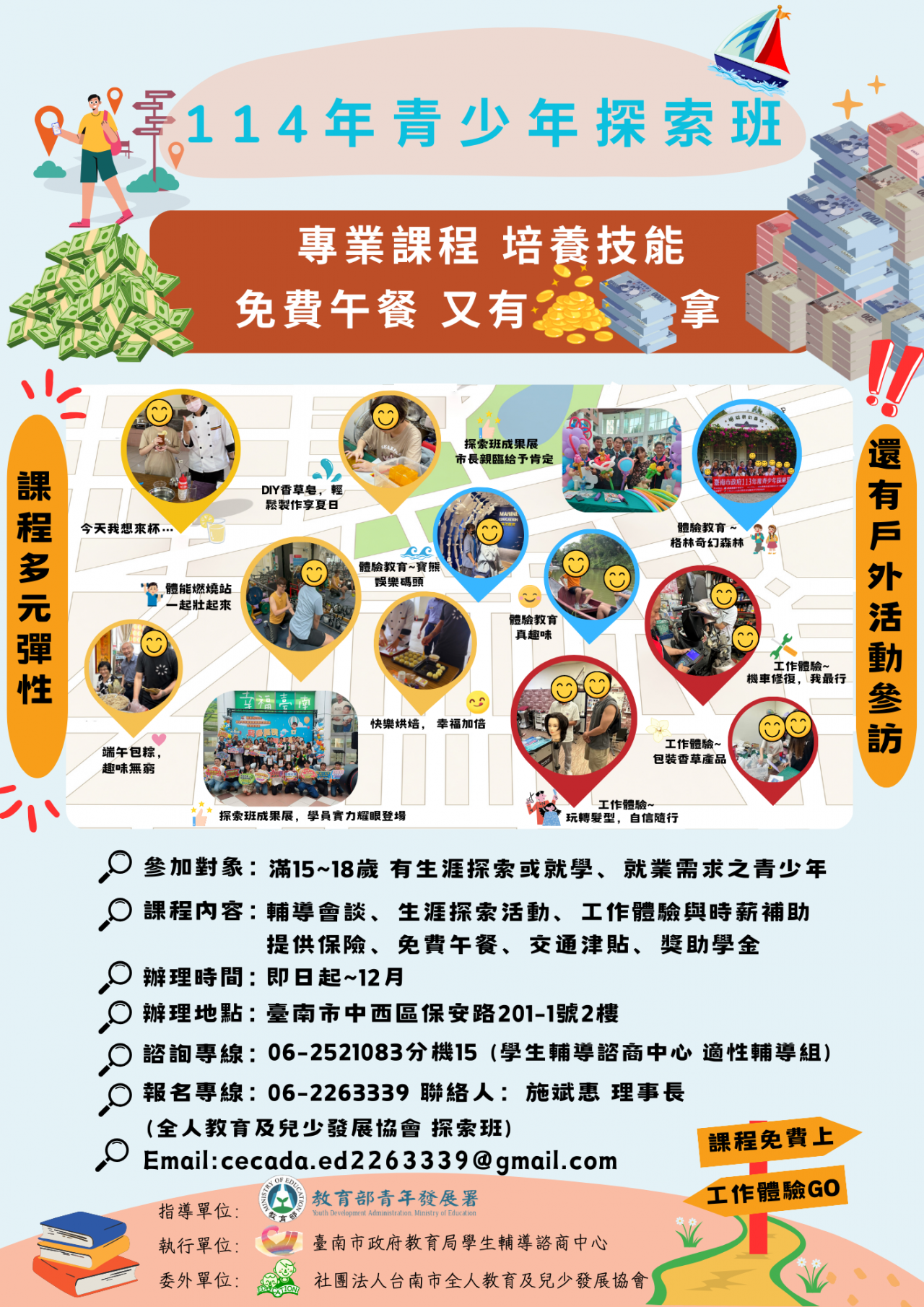 一、依據教育部青年發展署「青少年生涯探索號計畫」(下稱 青探號計畫)辦理「青少年探索班」。