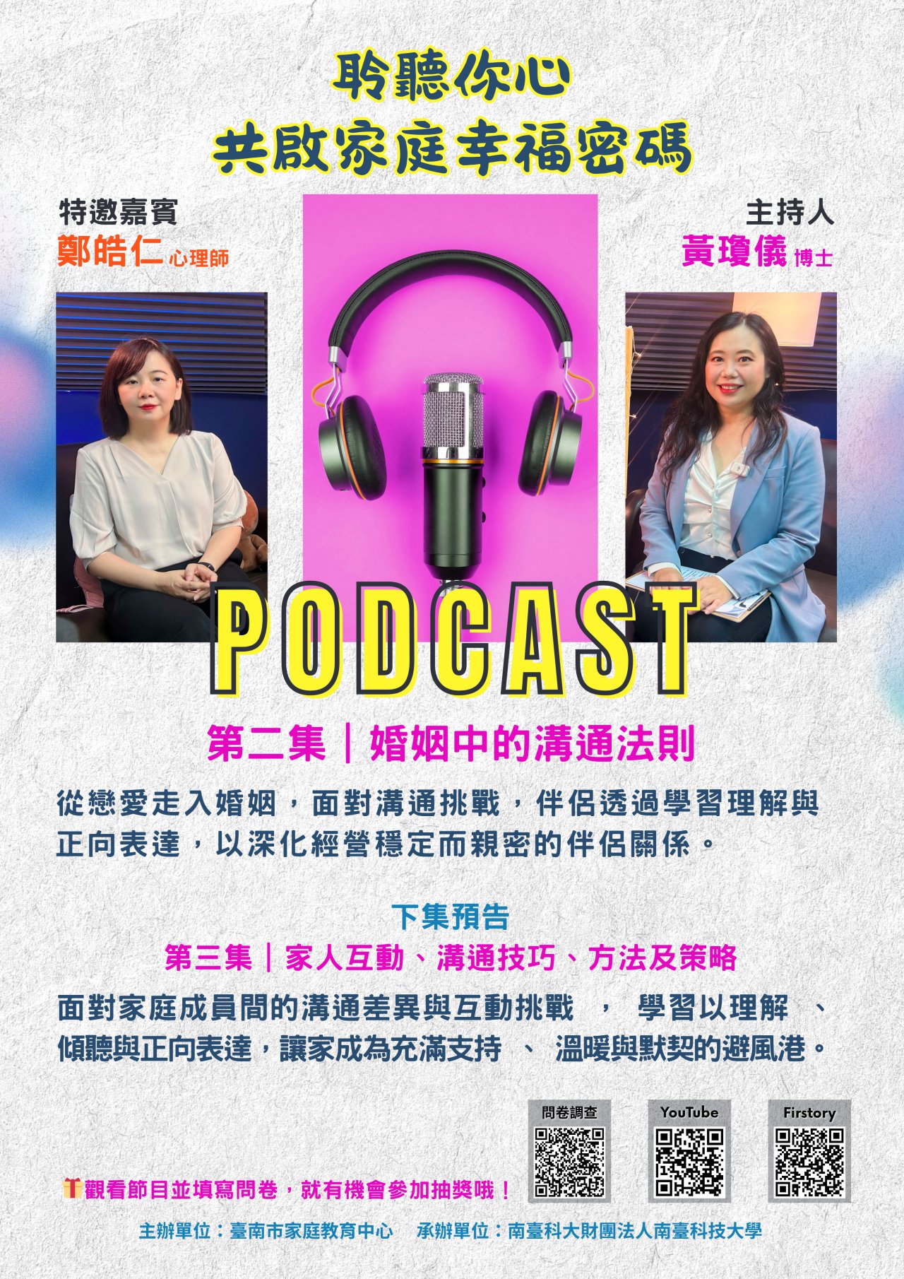 二、 Podcast【聆聽您心 共啟家庭幸福密碼】系列影片由臺南市家庭教育中心及南臺科技大學共同製播。 第二集|婚姻中的溝通法則 從戀愛走入婚姻,面對溝通挑戰,伴侶透過學習理解與正向表達,以深化經營穩定而親密的伴侶關係。歡迎點擊觀看影音。