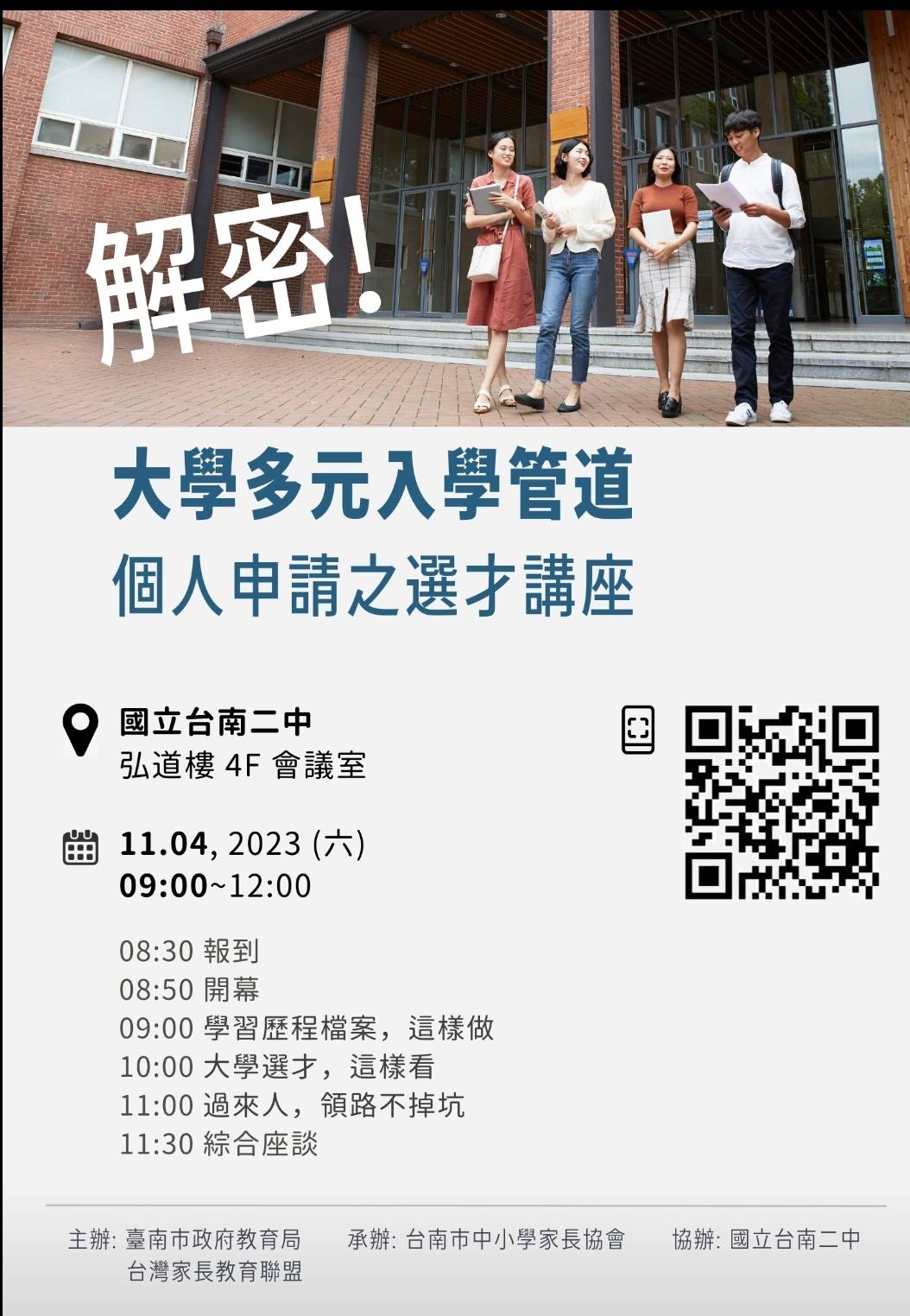 (一)時間: 112 年 11 月 4 日(星期六)09:00-12:00 。 08:30 報到 08:50 開幕 09:00 學習歷程檔案,這樣做 10:00 大學選才,這樣看 11:00 過來人,領路不掉坑 11:30 綜合座談