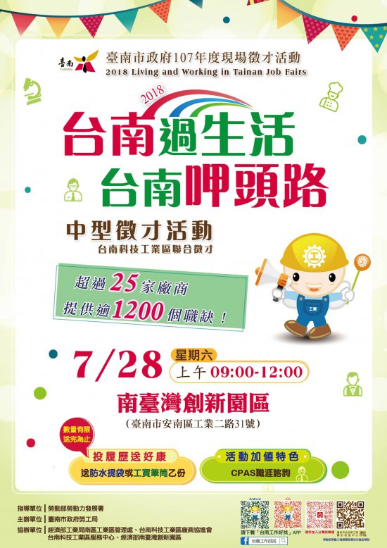 2018「台南過生活 台南呷頭路」第 1 場中型徵才,將在 4 月 14 日(六)下午 2 時於東區南紡購物中心辦理,當日有超過 25 家廠商,提供逾千個工作機會;現場還有投履歷送好康、 CPAS 職涯諮詢與屆退官兵服務,詳洽: 06-6330820 。