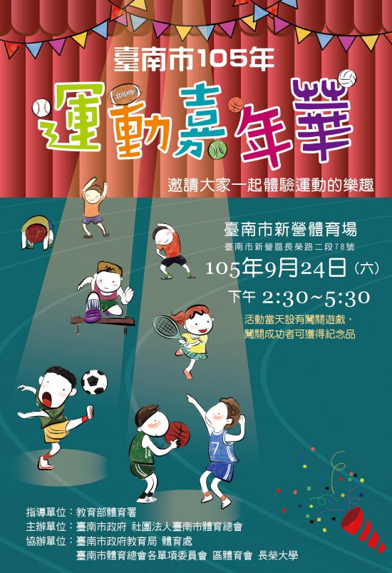 說明: 一、依據本市體育總會 105 年 9 月 10 日南市體總二字第 1050050887 號函辦理。 二、旨揭活動由臺南市政府與社團法人臺南市體育總會與共同主辦。 三、活動日期: 105 年 9 月 24 日(星期六)下午 2 時至下午 5 時 30 分。 四、活動地點:臺南市新營區體育場。 五、旨揭活動負責人為社團法人臺南市體育總會郭建宏主任,連繫電話: 2155333 。