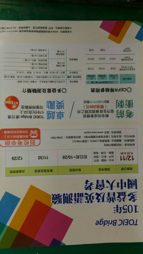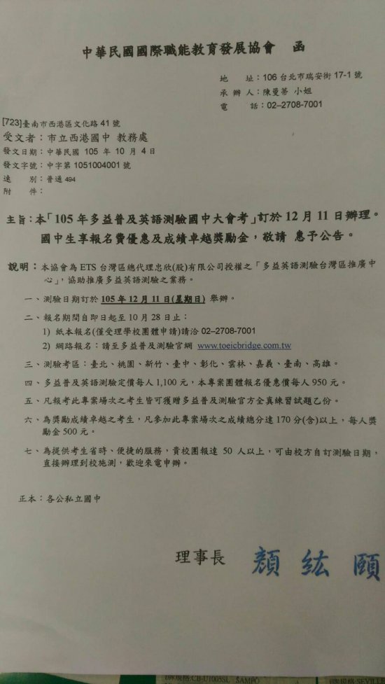 轉知105年多益普及英語測驗國中大會考訂於12月11日辦理