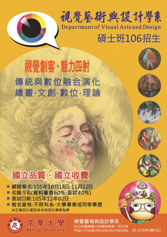 三、本校視設系師資優良、設備完善,分為繪畫、文創、數位、理論 等四大領域,歡迎對視覺藝術與設計有興趣或想跨領域學習之貴屬教職員踴躍報考。