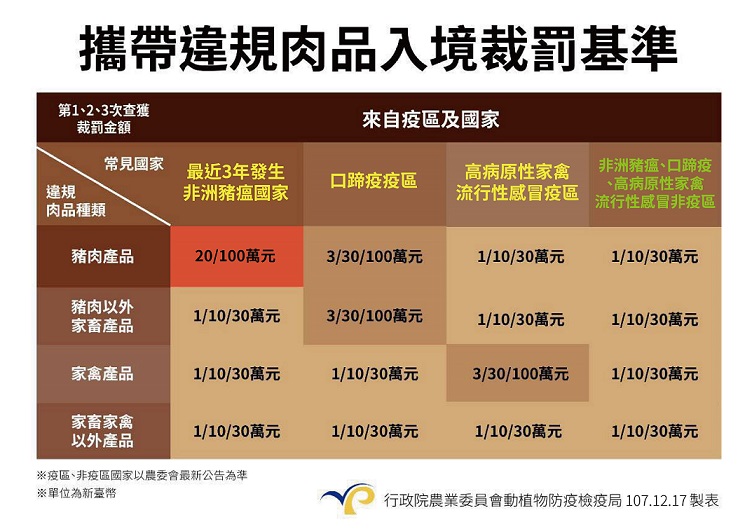 三、依據動物傳染病防治條例第 45 條之 1 規定及行政院農業委員會動植物防疫檢疫局 107 年 12 月 18 日公告的裁罰基準(如附件),旅客自近 3 年發生非洲豬瘟國家違規攜帶豬肉產品入境未申報檢疫者第 1 次處新臺幣(以下同) 20 萬元、第 2 次處 100 萬元以下罰鍰,外籍人士不具居留證,第 1 次受罰 20 萬元罰鍰且未能立即繳清者,拒絕其入境。