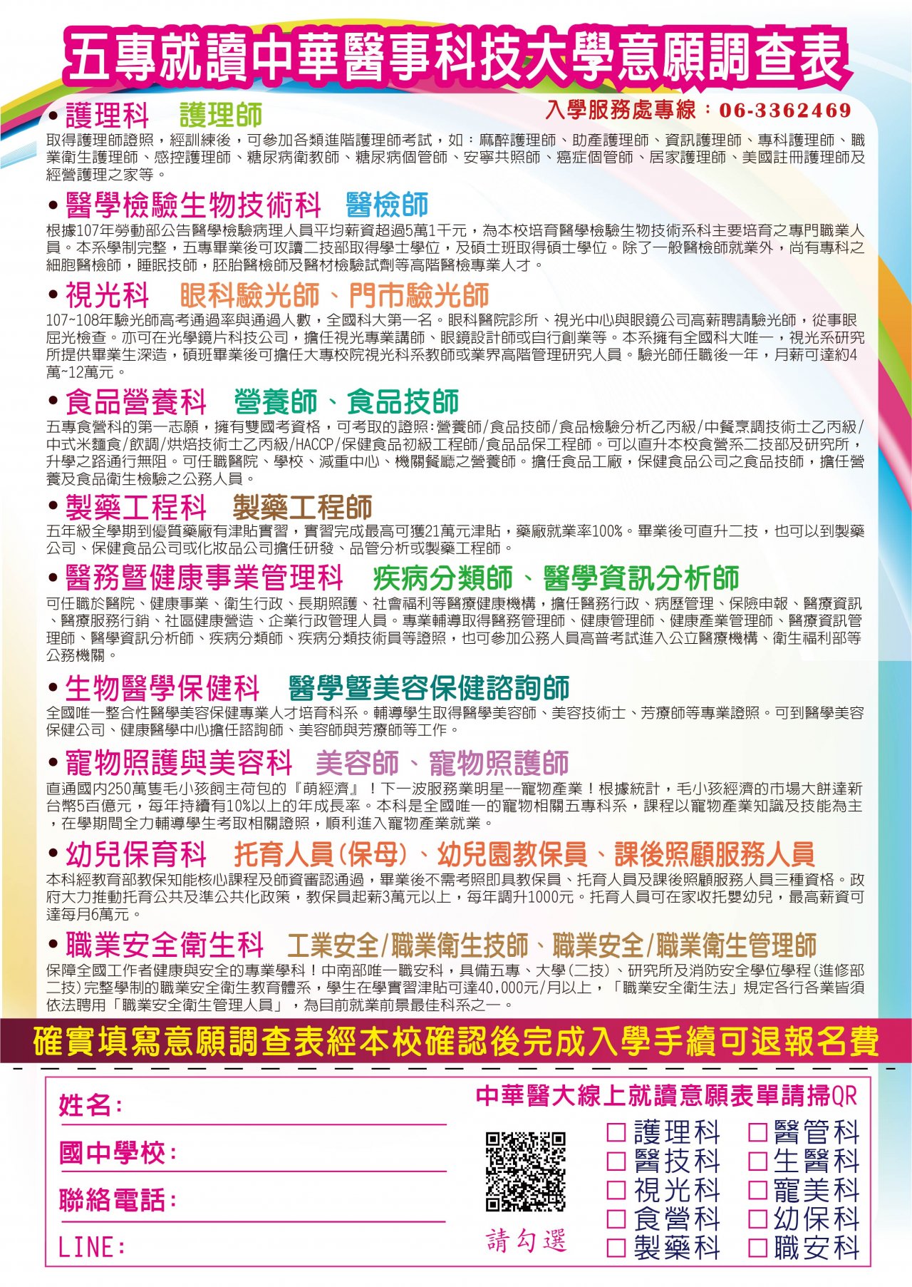 二、若有任何入學疑問,請洽詢中華醫大入學服務處人員:殷立德副校長 0958-930673 、陳柏衣主任 0966-586678 、陳怡如老師 0963-458733 、吳任晃老師 0932702896 、顏君芳老師 0920566031 ;或撥打入學招生專線:06-3362469 。