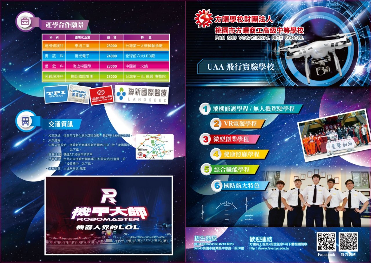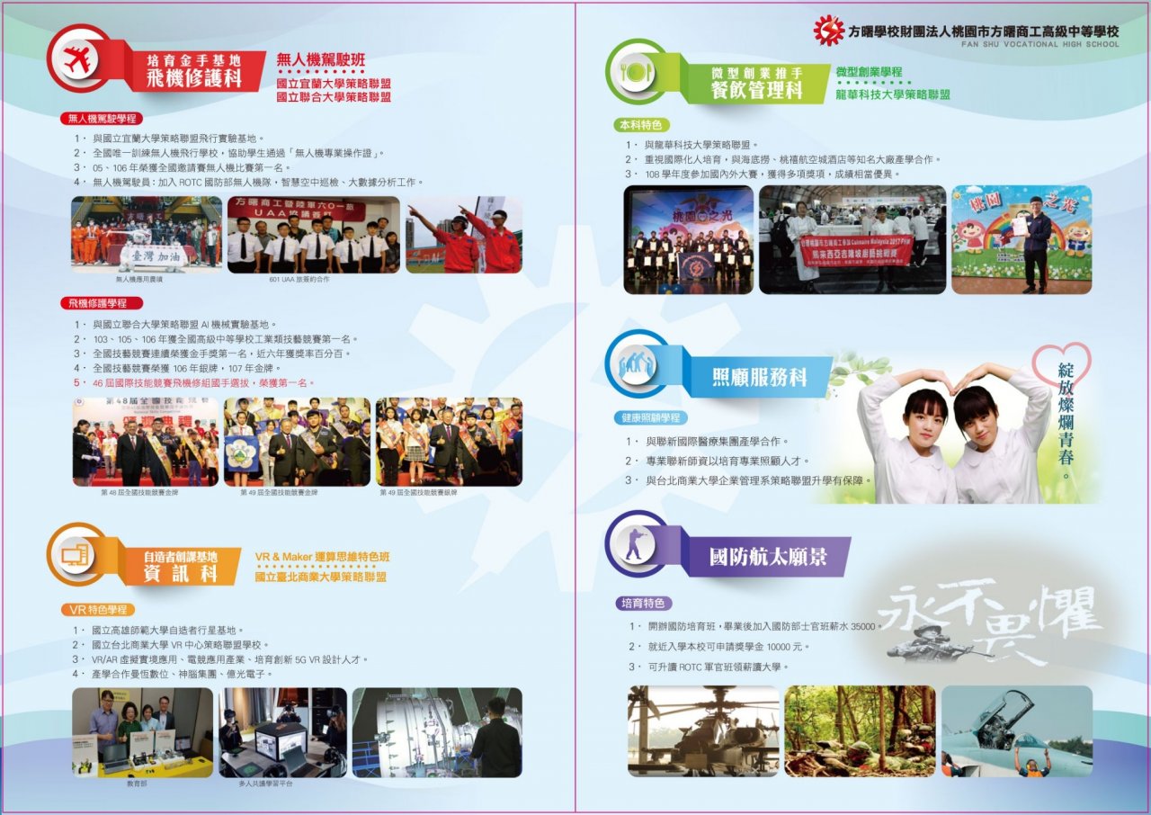 (一) 「無人機特色班」:飛機修護科與國立聯合大學機械工程系產學合作,提供學生專業飛行駕駛考證課程,培育航太精密機械及飛行駕駛人才。