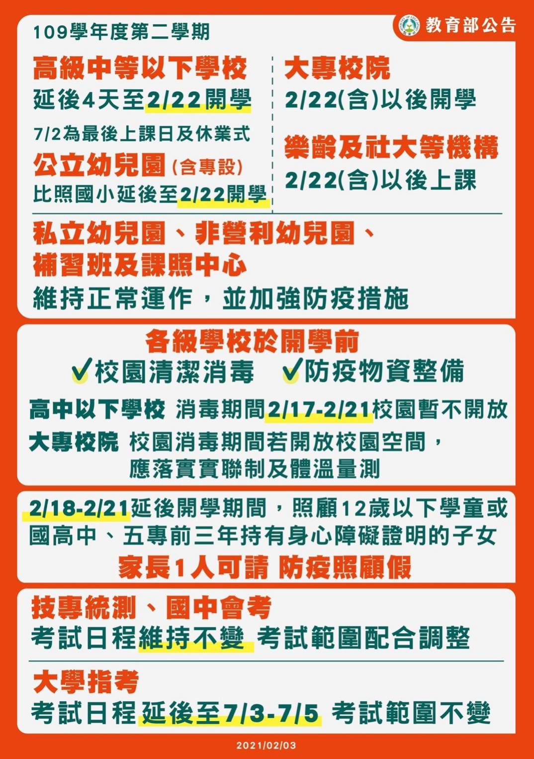 教育部宣布,為配合防疫, 109 學年第二學期延後四天至 2/22 開學,請家長與同學們特別留意。