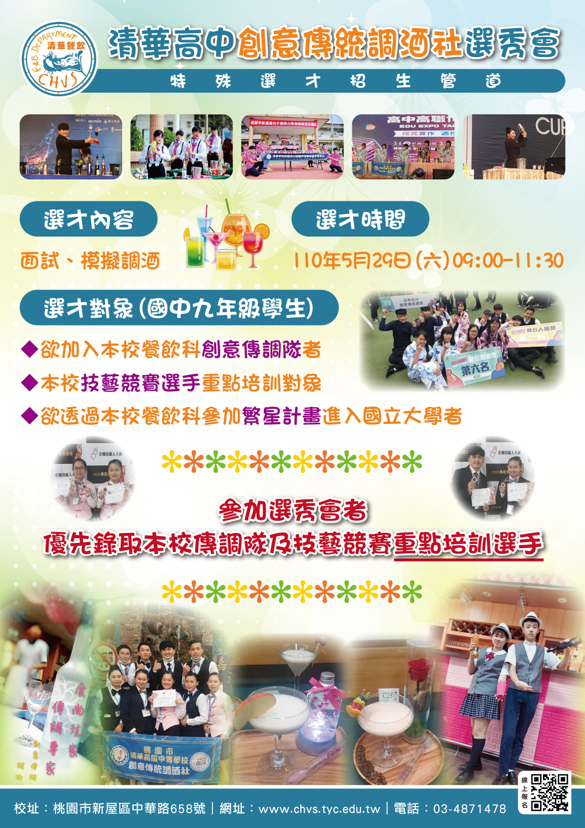 二、檢送本校「餐飲科創意傳統調酒社選秀會文宣(如附件)」,請貴校協助公告並鼓勵國中九年級學生踴躍報