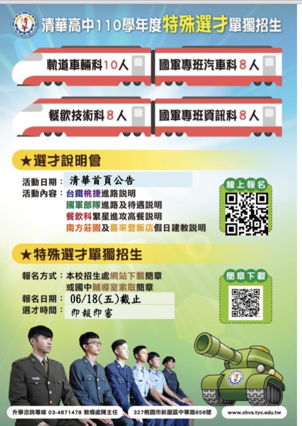 一、本校特殊選才單獨招生管道開設「軌道車輛科專班」、「國軍汽車科專班」、「國軍資訊科專班」及「餐飲科專班」。