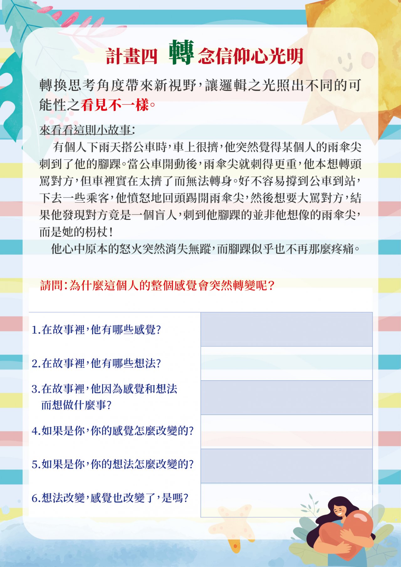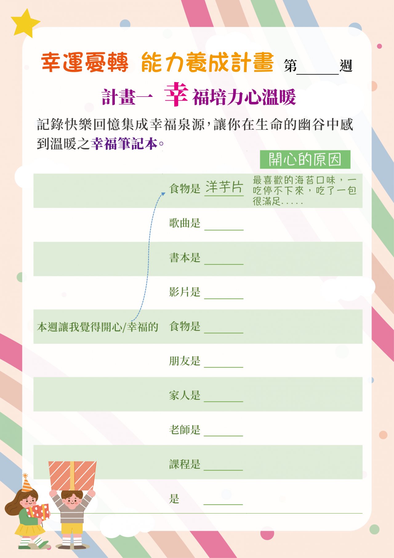 二、秋冬時節,學生尤其容易出現憂鬱、拒學等情緒困擾與行為問題,對此,本局輔諮中心特從心理專業之角度,製作因應憂鬱情緒之衛教圖卡及生活學習單,主軸為「心能力 2.0─幸運憂轉」。