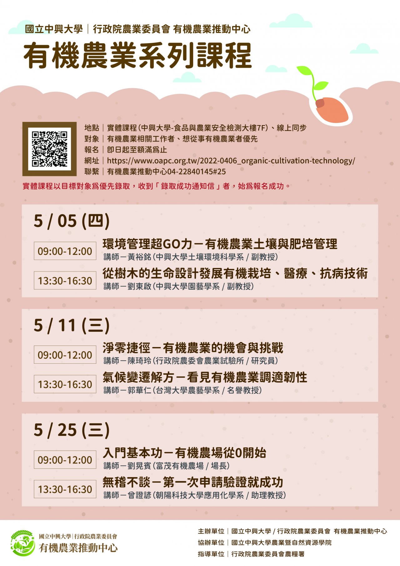 (三)報名方式:統一網路報名,實體課程名額有限,額滿為止;線上同步不限額(報名網址: https://www.oapc.org.tw/2022-0406_organic-cultivation-technology/