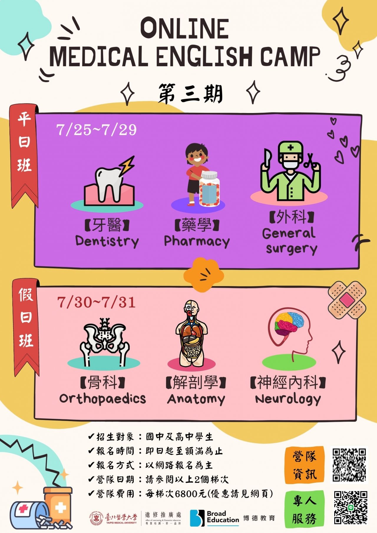 一、本校結合北醫專業醫療師資、國際師資及國際學生的資 源,創造英語的環境,讓學童們能藉由營隊期間的各種課 程與活動啟發對於醫學領域的興趣,延展對職涯探索的新 領域。 營隊將於 111 年 7 月 25 日至 111 年 7 月 31 日期間辦理「線上英文 醫學營第 3 期」,總共預定辦理 2 個梯次的營隊,分別為第 1 梯 平日班 7/25~7/29 、第 2 梯假日班 7/30~7/31 ,惠請貴單位協助 轉發,並歡迎共襄盛舉。