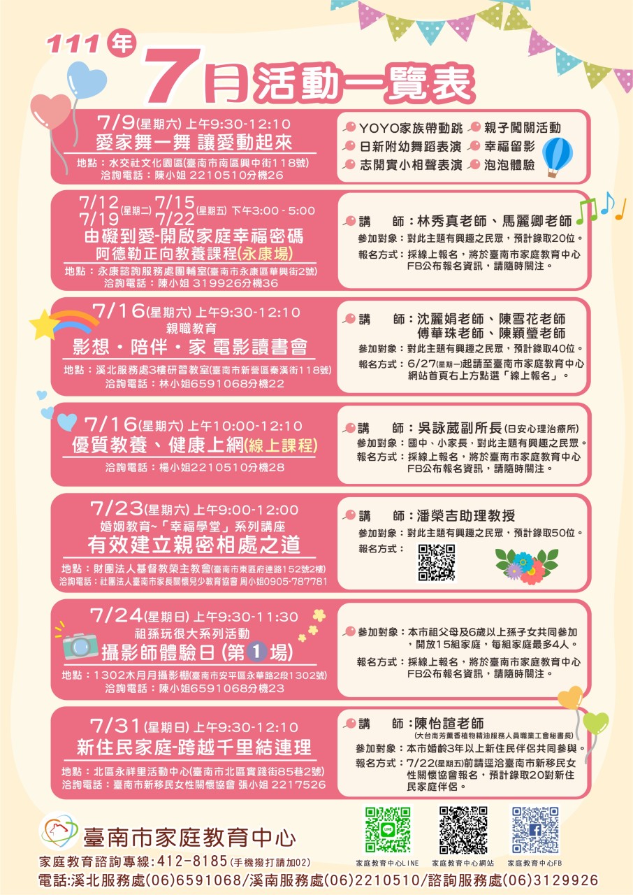 轉知臺南市教育中心7月分活動一覽表
