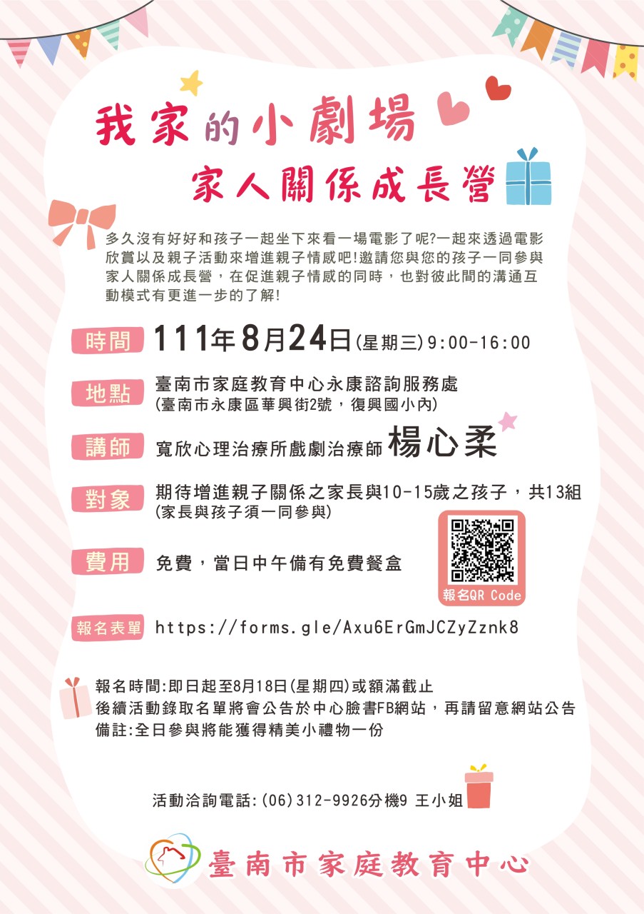 1.臺南市家庭教育中心邀請家長與 10-15 歲的孩子一同參與家人關係成長營,一起來透過電影欣賞以及親子活動來增進親子情感吧!在促進親子情感的同時,也對彼此間的溝通互動模式有更進一步的了解!