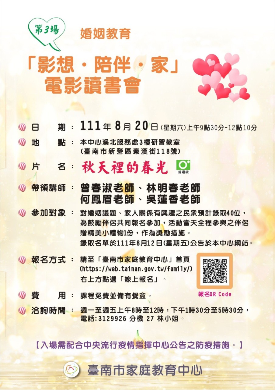 1.即日起受理報名,課程免費,名額有限,歡迎對婚姻議題、家人關係有興趣之民眾踴躍報名參加。