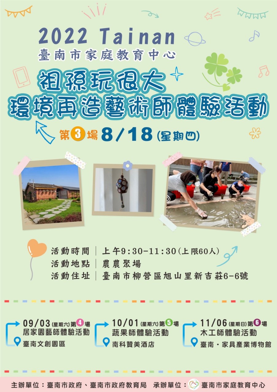 1.臺南市家庭教育中心邀請祖孫參加 111 年 8 月 18 日(星期四)上午 9 時 30 分至 11 時 30 分假農農聚場辦理「祖孫玩很大系列活動第③場-環境再造藝術師體驗活動」,歡迎祖孫一同參加喔!