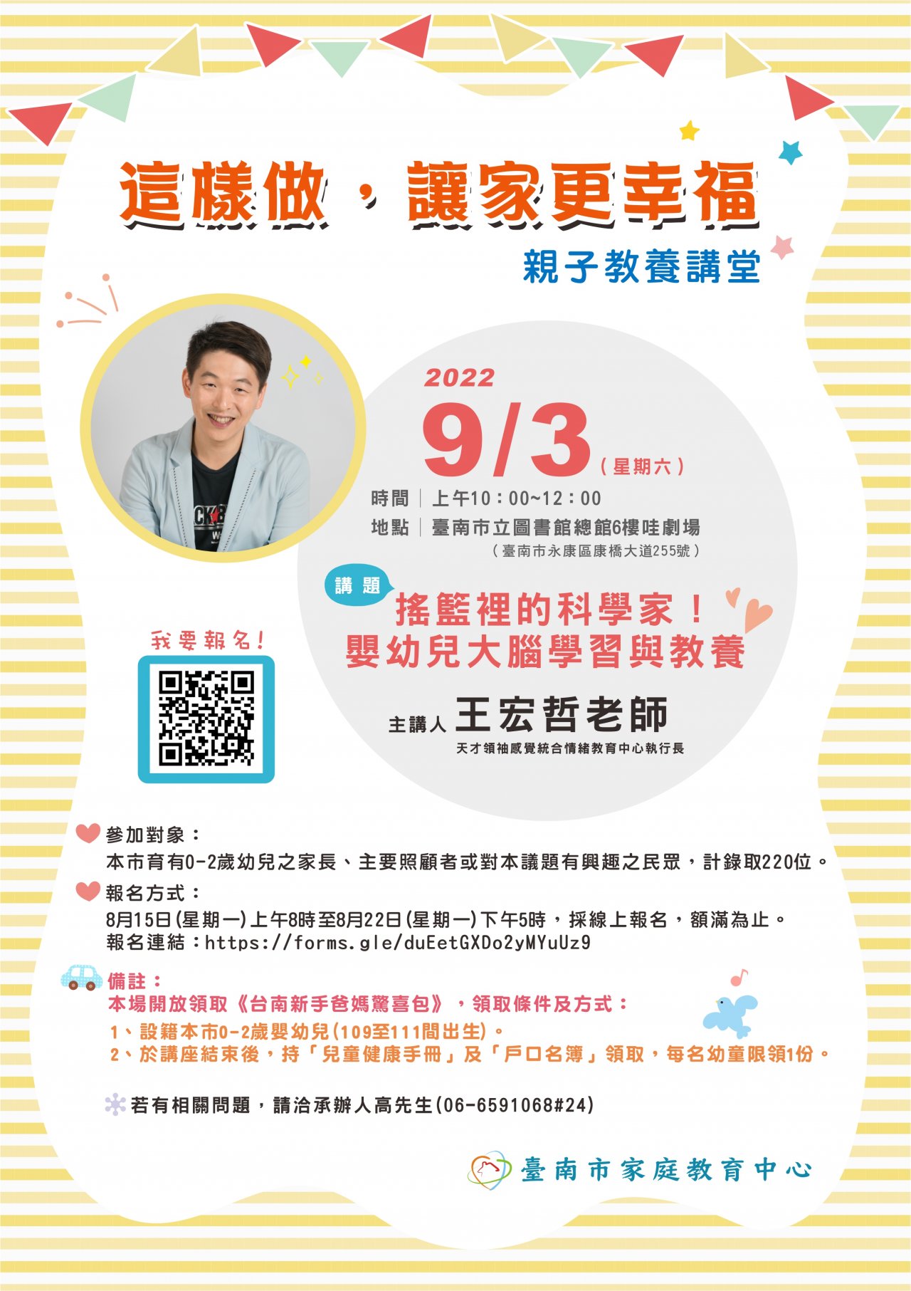 臺南市家庭教育中心邀請知名兒童發展專家、職能治療師及教養童書作家王宏哲老師,於本(111)年 9 月 3 日(星期六)上午 10 時至 12 時假臺南市立圖書館新總館 6 樓哇劇場,邀您一起來發掘「搖籃裡的科學家!嬰幼兒大腦學習與教養」。