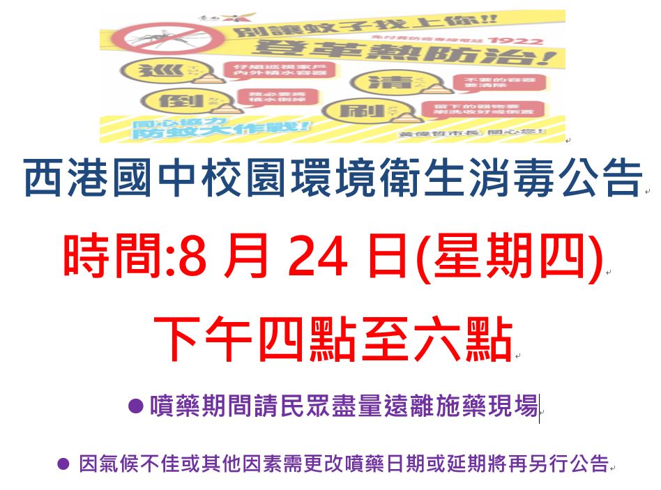本校將於8月24日(星期四)下午四點至六點進行環境衛生消毒