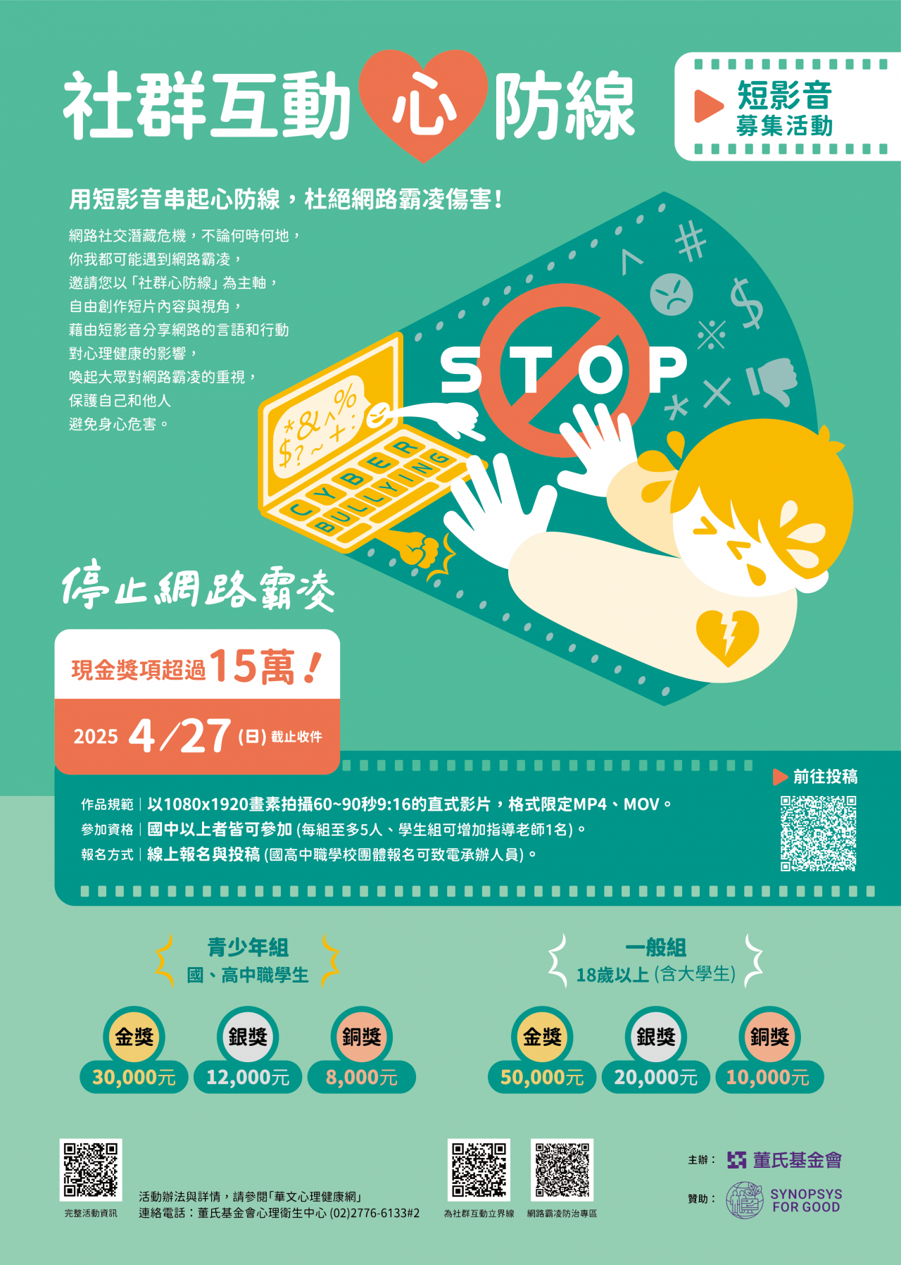 二、為鼓勵青少年透過活動參與了解預防網路霸凌傷害的重要 性,本會今年舉辦「社群互動”心”防線」停止網路霸凌 短影音募集活動,即日起開始收件至民國 114 年 4 月 27 日 止,邀請學生與民眾拍攝 60-90 秒直式短影音投稿,得獎作 品可獲得獎金,青少年組首獎現金三萬元、一般組現金五 萬元。活動辦法請參閱 https://reurl.cc/1XRnzQ 。