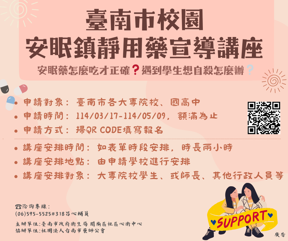 二、為強化青壯年及學生族群對於安眠鎮靜藥物用藥的正確觀 念,以校園為出發,針對校園師生舉辦一系列相關講座, 培養正向紓壓行為,提升抗壓能力,並增強安眠用藥正確 認知,期望能藉此將正確的觀念帶入校園,提高師生自殺 徵兆的敏感度,及早介入處遇及預防自殺事件發生。
