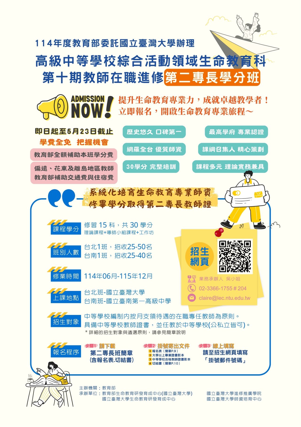 二、為落實十二年國民基本教育課綱精神,培育高級中等學校 生命教育科專業師資,教育部特委託本校生命教育研發育 成中心辦理旨揭學分班。
