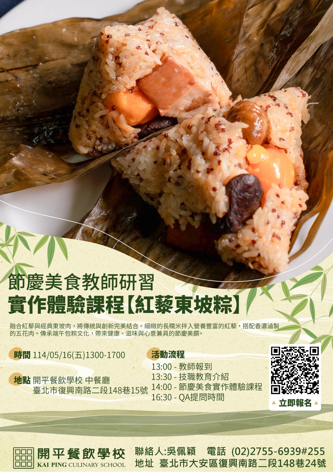 四、報名方式:採線上報名,請上”全國教師在職進修資訊 網”報名,課程名稱:節慶美食教師研習,課程代碼: 4993113 。報名截止日期: 114 年 05 月 13 日(二),課程名 單將於開課前三天確認遴選名單。