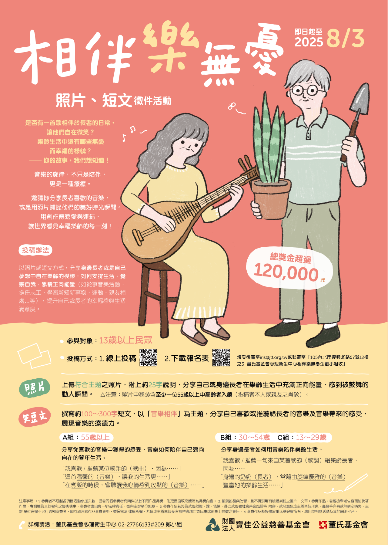二、為鼓勵青少年透過活動參與,關心身邊長者心理健康並增 加陪伴互動的機會,本會舉辦「相伴樂無憂-照片、短文徵 件活動」,即日起開始收件至民國 114 年 8 月 3 日截止。