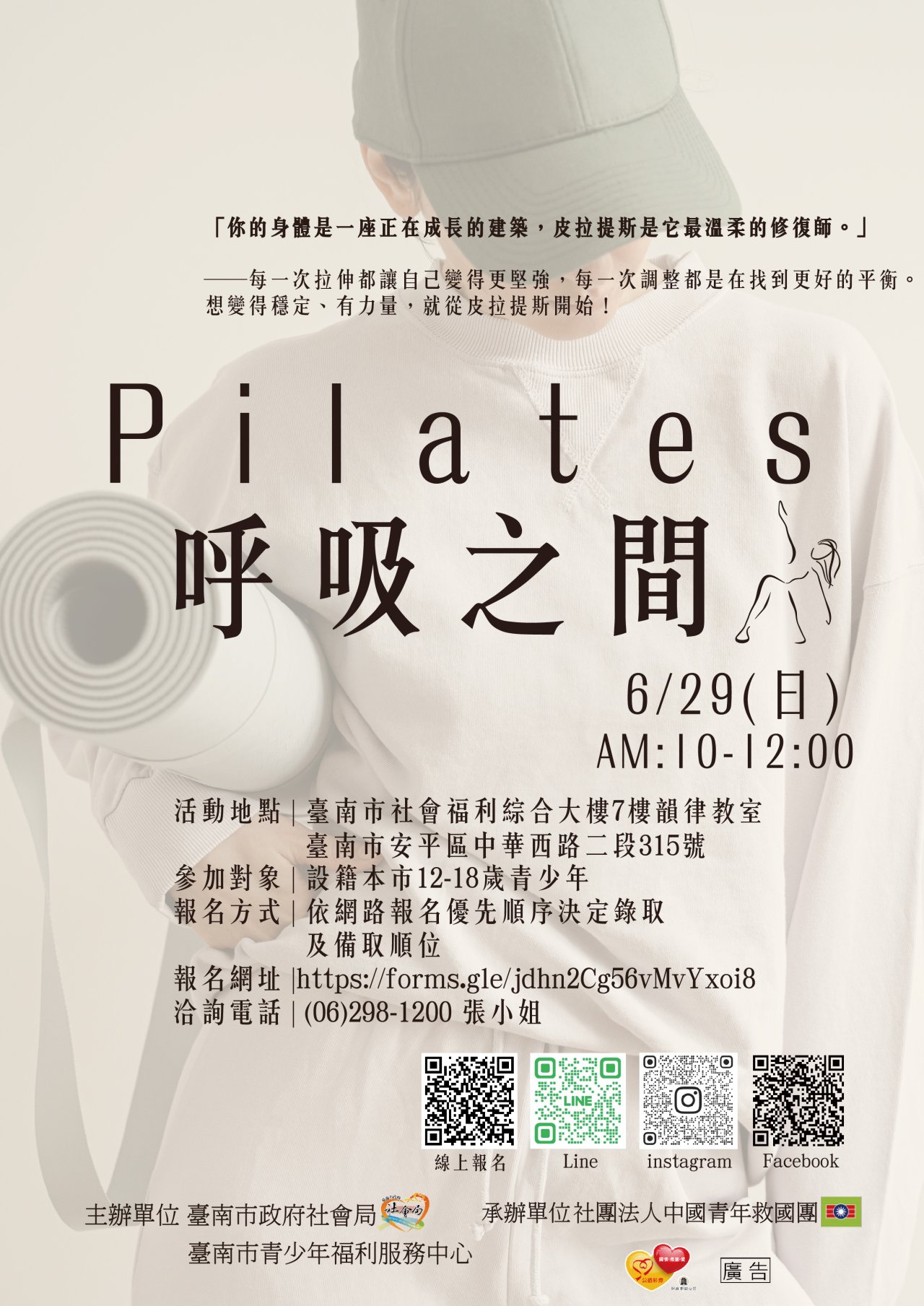 二、跑馬燈播放文字如下:在「呼吸之間」遇見平衡,臺南市 青少中心邀您 6 月 29 日一起舒展體態、強化肌力,找回身心 的節奏,詳洽 06-2981200 。