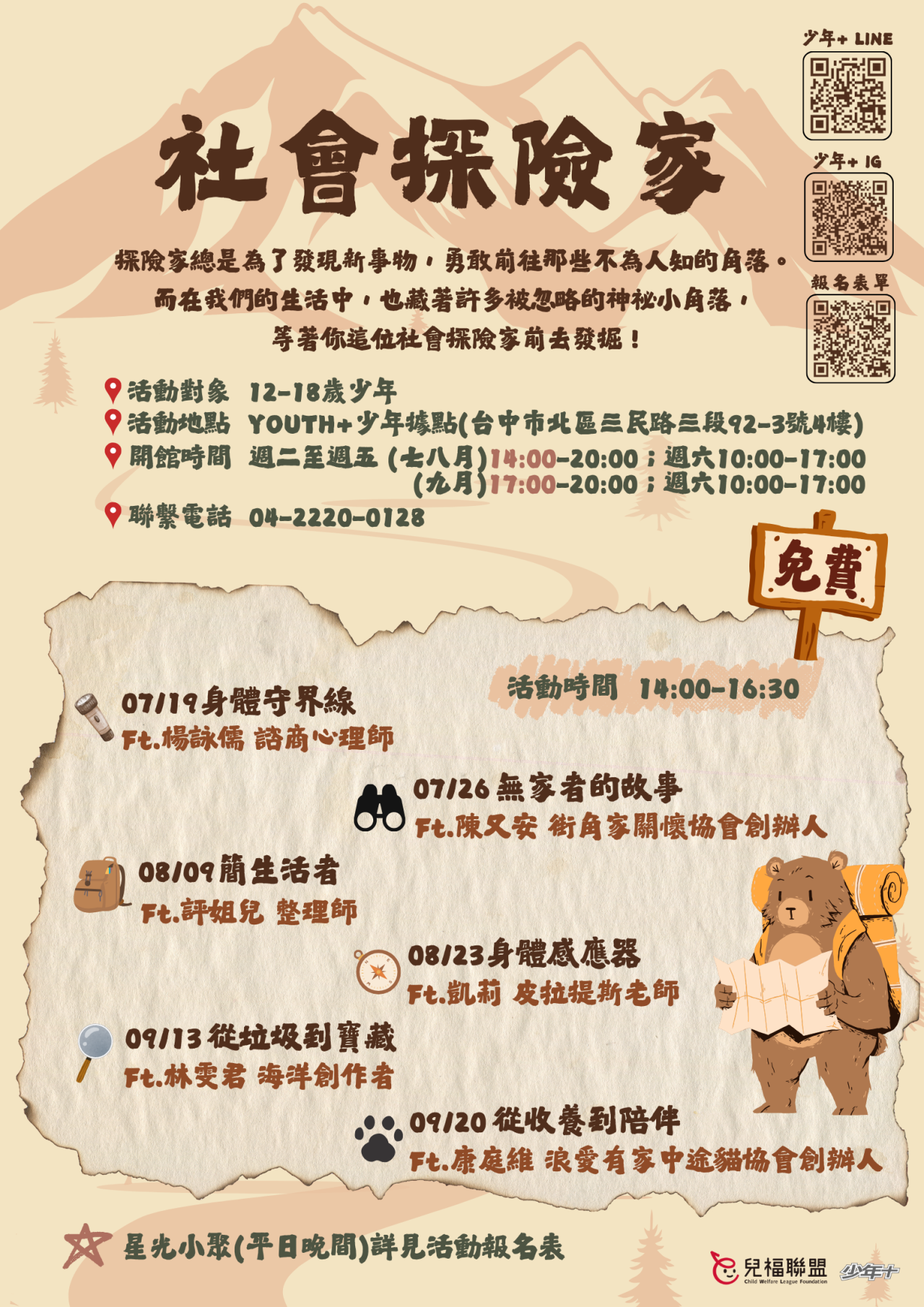 二、本季規劃「社會探險家」社會共好主題活動,期待透相關 課程讓孩子有機會認識與看見社會其他面貌,從中了解更 多社會組織與公益團體,並落實在日常生活中。課程及報 名資訊詳見活動 DM 。