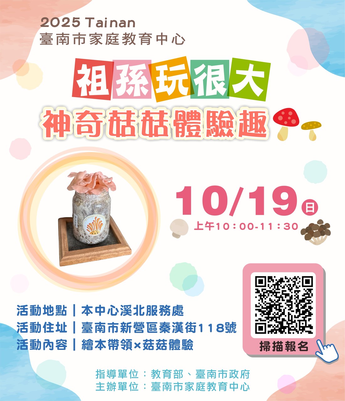 🌈臺南市家庭教育中心訂於 114 年 10 月 19 日(星期日)上午 10 時至 11 時 30 分於本中心溪北服務處 2F 研習教室(臺南市新營區秦漢街 118 號)辦理📙聽繪本×🍄菇菇體驗活動,歡迎祖孫一同參加喔👵👴👶!活動免費,採線上報名,詳細資訊請至臺南市家庭教育中心 FB 粉絲專頁(https://www.facebook.com/tainanfamily 查詢。