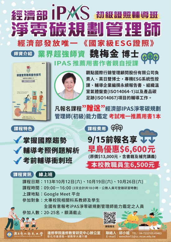 一、「113 年 iPAS 淨零碳規劃管理師(初級)能力鑑定輔導班(線上班) 」
