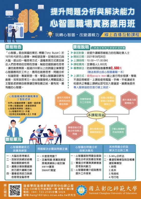 一、「提升問題分析與解決能力-心智圖職場實務應用班」課程 時間為 110 年 9 月 26 日(日) 10:00-17:00 ,合計 6 小時,公務 人員及教師可登錄研習時數,本課程為遠距直播互動課 程,課程費用每人 3,600 元,贈教師出版心智圖書籍,防疫 期間線上課程超值優惠方案每人 2,500 元。