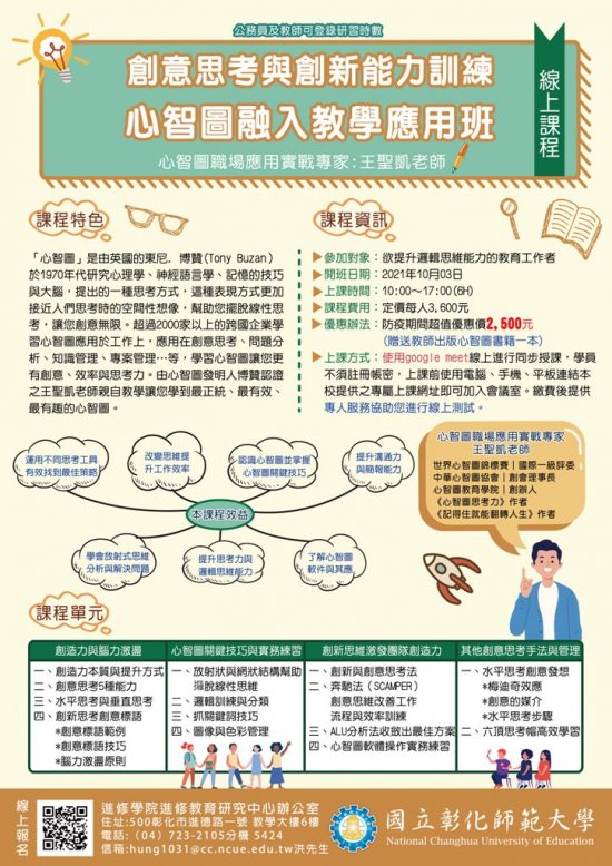 二、「創意思考與創新能力訓練-心智圖融入教學應用班」課程 時間為 110 年 10 月 3 日(日) 10:00-17:00 ,合計 6 小時,公務 人員及教師可登錄研習時數,本課程為遠距直播互動課 程,課程費用每人 3,600 元,贈教師出版心智圖書籍,防疫 期間線上課程超值優惠方案每人 2,500 元。