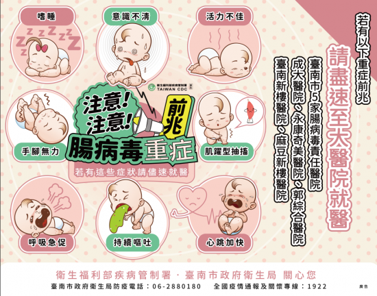 (一)注意腸病毒重症警訊!若您的孩子出現嗜睡、意識不清活力不佳、肌躍型抽搐、手腳無力、呼吸急促、持續嘔吐、心跳加快等重症前兆,請儘速前往大醫院就醫!腸病毒可能引發嚴重併發症,務必提高警覺。臺南市 5 家腸病毒責任醫院:成大醫院、永康奇美醫院、郭綜合醫院、臺南新樓醫院、麻豆新樓醫院。預防勝於治療,勤洗手、避免接觸病童,共同守護孩子健康!