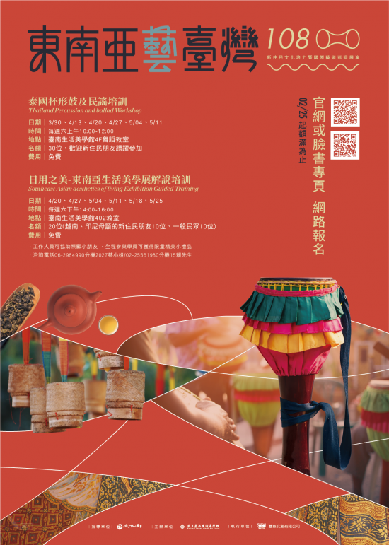 一、本年度辦理「泰國杯型鼓及民謠培訓」、「日用之美-東南亞生活美學展解說培訓(越南語、印尼語、中文)」,邀請大家一同來體驗東南亞生活工藝與民謠。 二、以上活動均為免費參加,採網路報名,請至臉書專頁瀏覽(https://www.facebook.com/nrseaca/)。