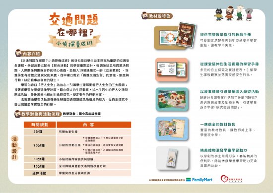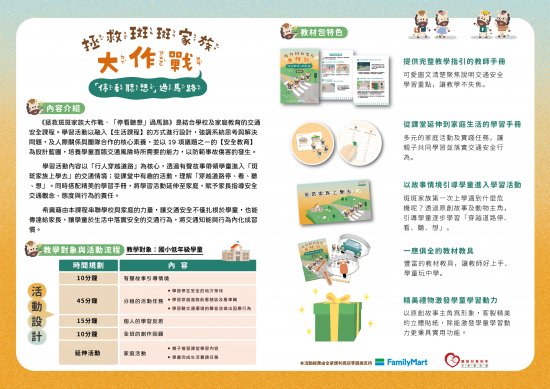 一、本教材包以「行人安全」為核心學習內容,免費提供教師手冊、學習手冊、教具、教學簡報及宣導品,提供教師實施交通安全教育所需資源,詳見附件報名簡章。