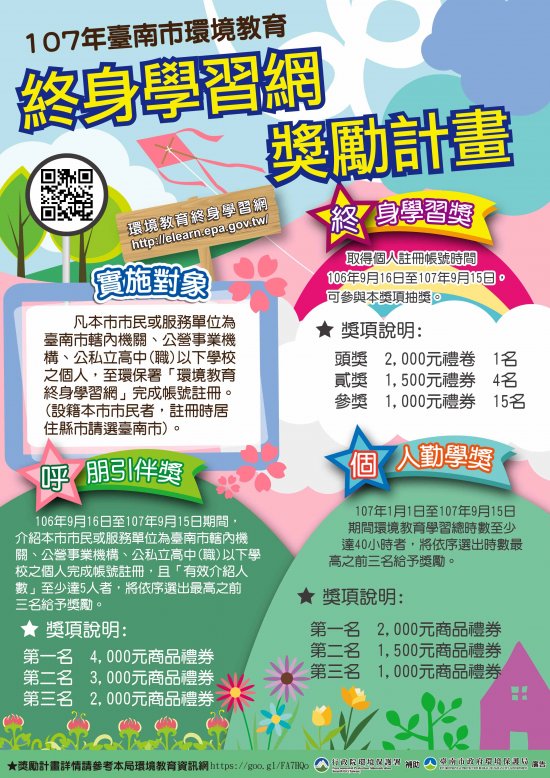 二、實施對象為取得環境教育終身學習網有效帳號之個人,且註冊資料之居住地為臺南市或服務單位為臺南市轄內機關(構)、公私立高中職以下學校,計畫期間至 107 年 9 月 15 日止,獎勵辦法如下所示: