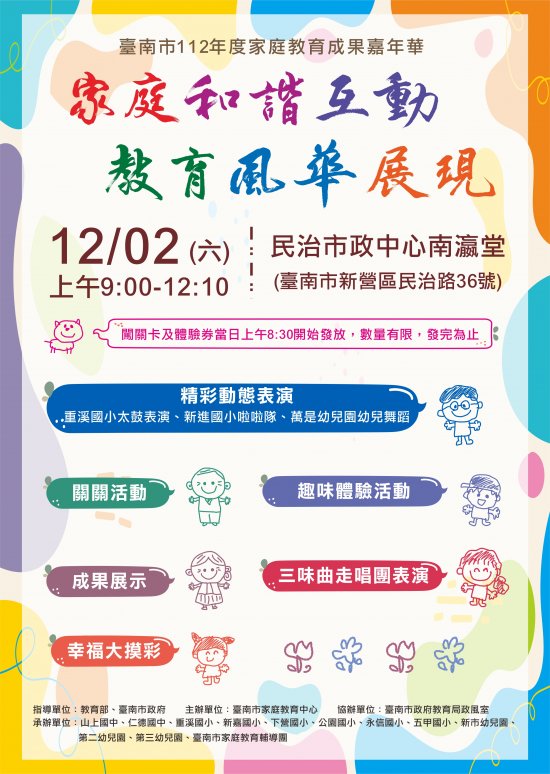 一、目的:為展現 112 年度本市家庭教育辦理成果,促進各校經驗交流,特辦理本嘉年華活動。