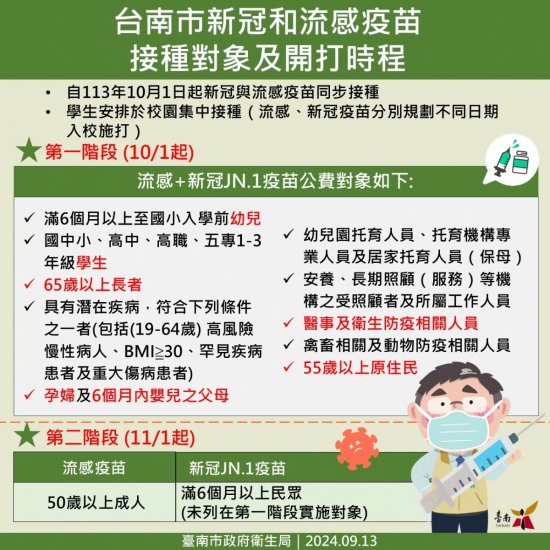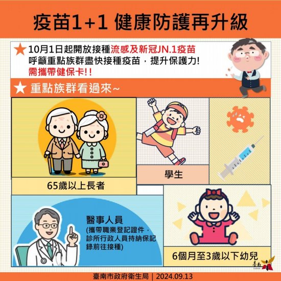 10 月 1 日起開放第一階段對象疫苗接種,包含醫事及衛生防疫相關人員、 65 歲以上長者、 55 歲以上原住民、長期照護服務機構之受照顧者及其所屬工作人員、 6 個月以上至五專三年級之學童、孕婦及 6 個月內嬰兒之父母、托育人員、具潛在疾病、罕見疾病與重大傷病者、以及禽畜動物防疫相關人員等;第二階段自 11 月 1 日起,流感疫苗開放 50-64 歲成人、新冠疫苗開放 6 個月以上民眾接種,呼籲符合接種資格者請攜帶健保卡、身分識別文件至各醫療院所接種。
