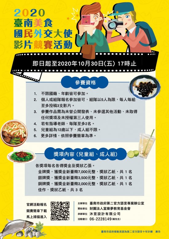 五、「2020 臺南美食國民外交大使影片競賽活動」提供參與者及優勝者獎金等獎項,希冀藉由英語影片競賽方式提升學生英文口說能力,為能使學生周知相關訊息,特發此函公告周知,惠請 貴校鼓勵學生踴躍參與,活動宣傳網頁:https://reurl.cc/xZ8xWE
