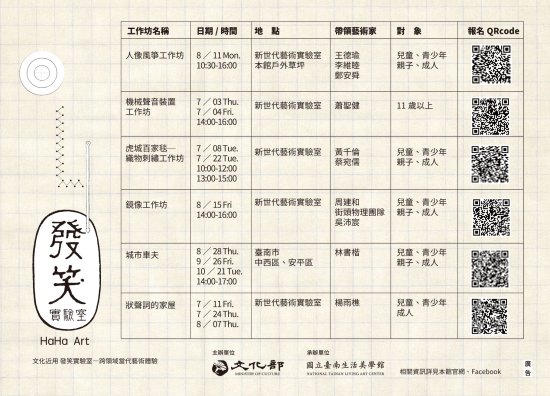 一、以「發笑實驗室」為名,邀請多位專業藝術家(王德瑜、蕭聖健、黃千倫、吳沛宸、林書楷、楊雨樵)規劃設計極具創意與趣味性的藝術體驗內容,以期參與者能體驗有趣的藝術,同時在「玩耍」中發展藝術作品。