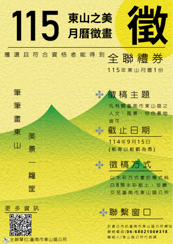 一、為促進民眾深入認識東山區歷史、文化、自然風貌及在地特色,特舉辦「115 年東山之美月曆繪畫徵集」活動。入選之作品將收錄於 115 年東山月曆中,共同呈現東山的魅力,推動地方文化的傳承。