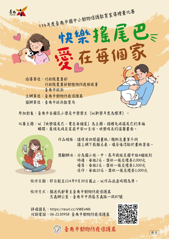一、為讓動物保護觀念與尊重生命價值扎根校園,本處將舉辦旨揭繪畫比賽,期望透過學生純真的視角與豐富的想像力,藉由畫筆描繪日常對動物的關愛,在創作過程中啟發同理心,同時思考飼養動物所需的責任與付出,理解每一個生命都應被善待與尊重,讓動物保護的種子從校園萌芽,深植於心。