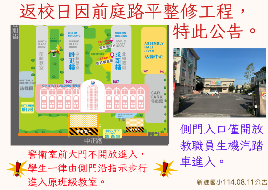 1.因勤學樓前庭工程仍在進行中,因此上放學時間無法開放正門口通行,僅能由停車場側門出入,人車同出入口,請老師進校門時,務必要當心安全。另外上學時間也鼓勵學生分流,可從安和街校門口進入校園。