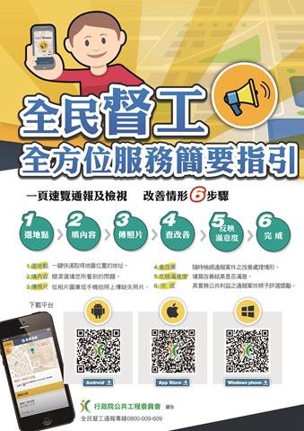 公共工程要更好,全民督工不可少,歡迎下載全民督工 APP ,快速通報又便捷,歡迎民眾踴躍下載。