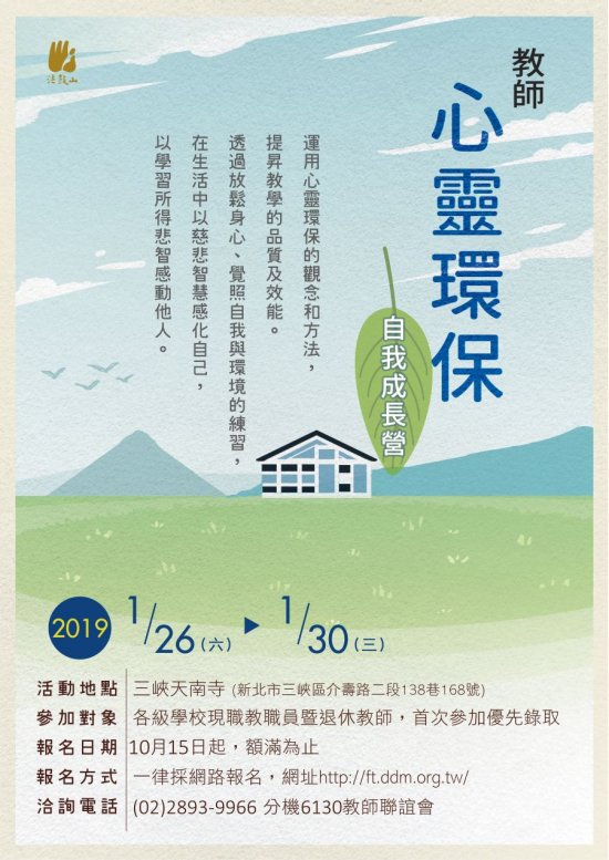 主旨:法鼓山佛教基金會訂於 108 年 1 月 26 日(星期六)至 1 月 30 日(星期三)辦理「2019 寒假教師心靈環保自我成長營」活動,詳如說明。
