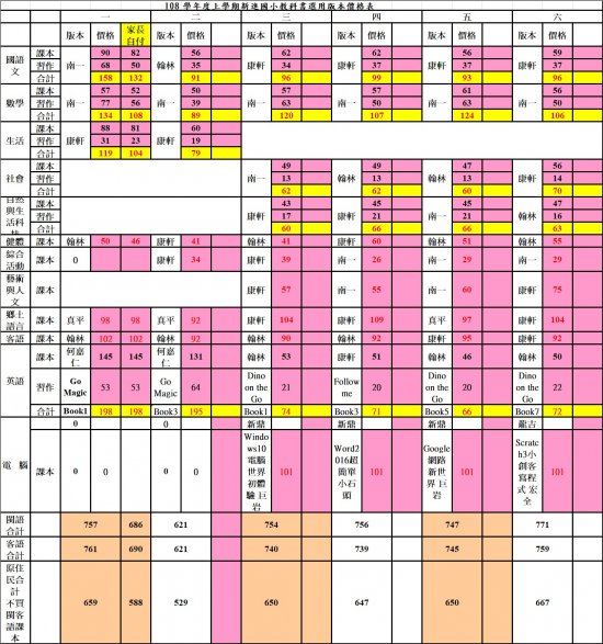 108 學年度上學期教科書版本價格表如附件圖
