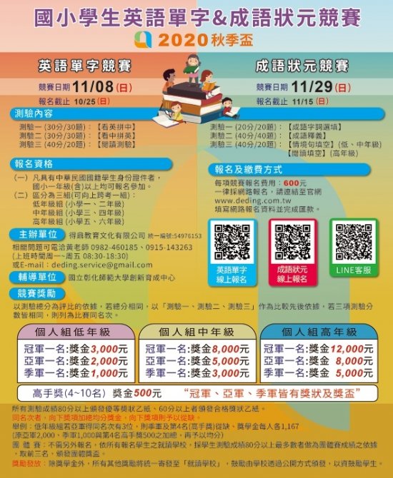 二、報名日期:英語單字即日起至 109 年 10 月 25 日(星期日)中午 12 時止、成語狀元即日起至 109 年 11 月 15 日(星期日)中午 12 時止,需完成繳費報名手續。