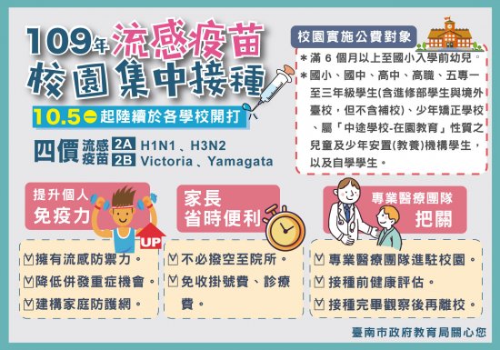 校園流感疫苗接種將於 109 年 10 月 5 日開始接種,本校配合臺南市政府衛生局合約醫療團隊:胸腔病院,將於 109 年 10 月 6 日(星期二)進行校園流感疫苗接種服務,鼓勵學童施打流感疫苗。