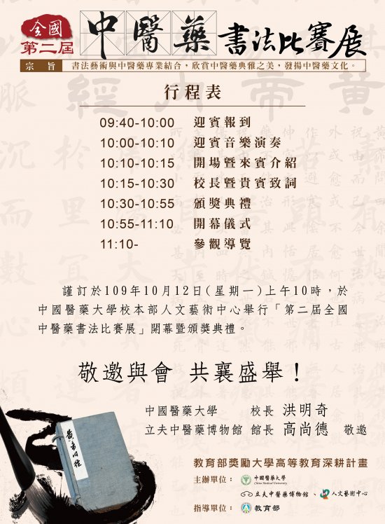 四、展出內容:展出第二屆中國醫藥大學全國中醫藥書法比賽 得獎共 54 幅作品,每幅作品中醫藥內容邀請中醫藥專家專 業闡釋,書法藝術與中醫藥專業結合,欣賞中醫藥典雅之 美,發揚中醫藥文化。